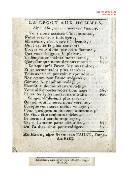 | Incipit du couplet | Vous nous accusez d'inconstance / Notre sexe trop indulgent |