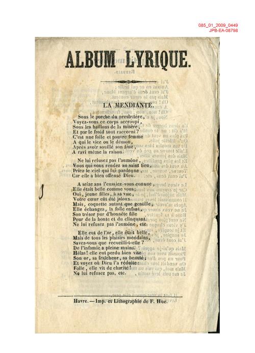 Laforte : non-référencée - VI, Coirault : non-référencée - 1062** Thème : 1062 - Les relations sociales - Sociales Résumé : A seize ans l'eussiez vous connue, Elle était belle comme vous, Elle eut de l'or elle était belle, Elle échangea la folle enfant, Son trésor pur d'honnête fille, Mais dans tous les plaisirs mondains, Savez-vous que recueilli-t-elle, De l'infamie à pleines mains Mots Clé : porche, portail, entrée monumentale - presbytère, cure - froid - femme(s), bonne(s) femme(s) - diable, démon, Satan - Dieu - fille(s), fillette(s) - enfant(s) - Voir la liste des oeuvres |