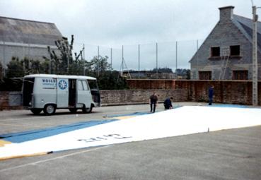 Travail de voile de la voilerie Le Rose sur le terrain de sport