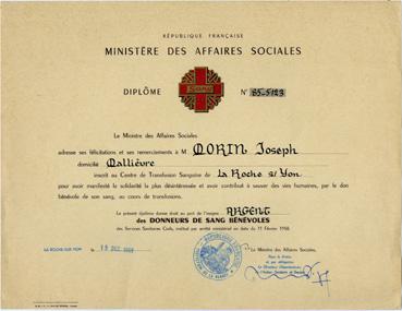 Diplôme des Donneurs de sang bénévoles