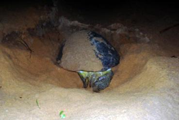 Tortue géante creusant son nid