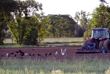 Vol d'oiseaux derrière un tracteur tirant une déchaumeuse