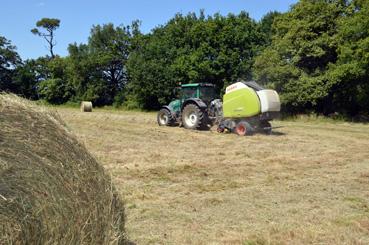 Fenaison avec une presse à balles rondes par Sébastien Shwab, agriculteur biologique