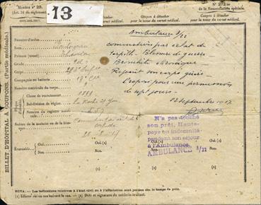 Billet d'hôpital de Théodore Pontoizeau