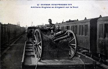 Mots Clé guerre 1914-1918 ; canon, cannonade ; armement ; train(s) ferroviaire(s), wagon(s) ; militaire(s), soldat(s), ; Anglais ;