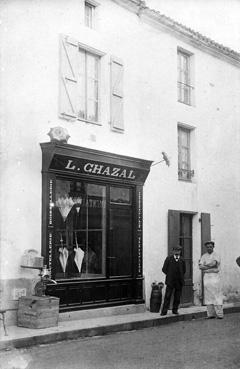 | Note | Magasin de coutellerie, boissellerie, ombrelles et parapluies tenu par Jean Léger CHAZAL (1876, Larrode, Puy de Dôme, 1957 La Roche-sur-Yon. En habit sombre sur la photo ci-dessus), à partir de 1910, 56 rue Nationale (appelée aussi Grande Rue). |