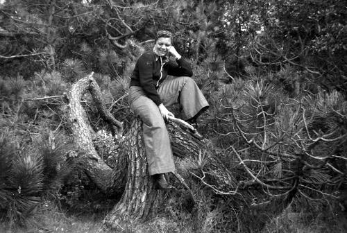 Jeune femme en bordure d'une sapinière