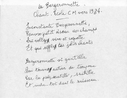 Laforte : non référencée - II, Coirault : non référencée - 1105** Thème : 1105 - Les animaux - Oiseaux Résumé : Pauvre petit oiseau des champs, Inconstante bergeronnette. qui voltiges, vive et coquette, Et qui siffles tes jolis chants. Bergeronnette si gentille, Qui tournes autour du troupeau. Par les prés sautille, sautille, Et mire-toi dans le ruisseau Mots Clé : oiseau(x), oisillon(s) - troupeau - rivière, fleuve, cours d'eau, ruisseau - fleur(s), fleuriste - sentier et chemin - chanteur(s), chant, chanson, chansonnette - ami(s)(e)(es), mie - Voir la liste des oeuvres |