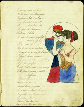 | Note | extrait du cahier manuscrit de chansons, dessin à la plume aquarellé par Jean Tesson, lors de son service militaire à Vannes (56) signé : fait en août 1910, au 28e régiment de cavalerie |