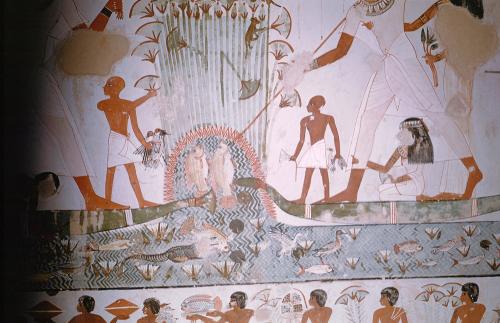 | Note | Voici les vendanges et les plaisirs de la chasse et de la pêche. On voit le maître harponner d'énormes poissons d'un côté, et de l'autre lancer un boomerang sur des oies sauvages efrayées, émergeant d'un rideau de payrus aux panicules épanouïes. |