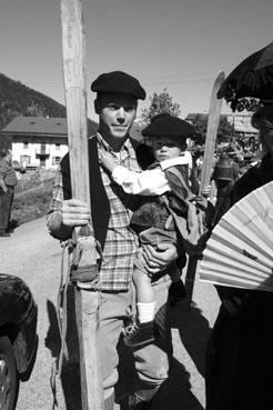 Reconstitution de geste à la Fête du costume - Skieur portant un enfant