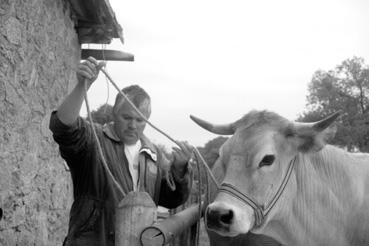 Pierre Gatard, de La Rebourgère, liant ses vaches parthenaises