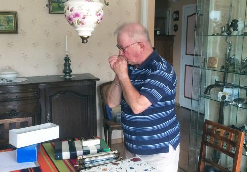 Michel Decaux jouant de l'harmonica