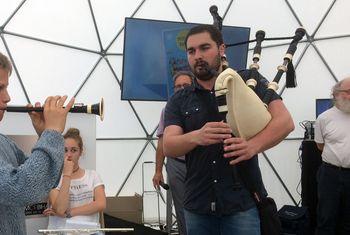 | Note | Les élèves du Conservatoire et leurs professeurs ont ponctué la conférence de performances musicales à la harpe, au biniou et à la bombarde. La conférence sous la géode présentant le répertoire musical du Golfe et le recueil Mousig Bihan. Avec Jean-Yves Fouqueray, directeur du Conservatoire, Michel Colleu et Didier Quéval. |