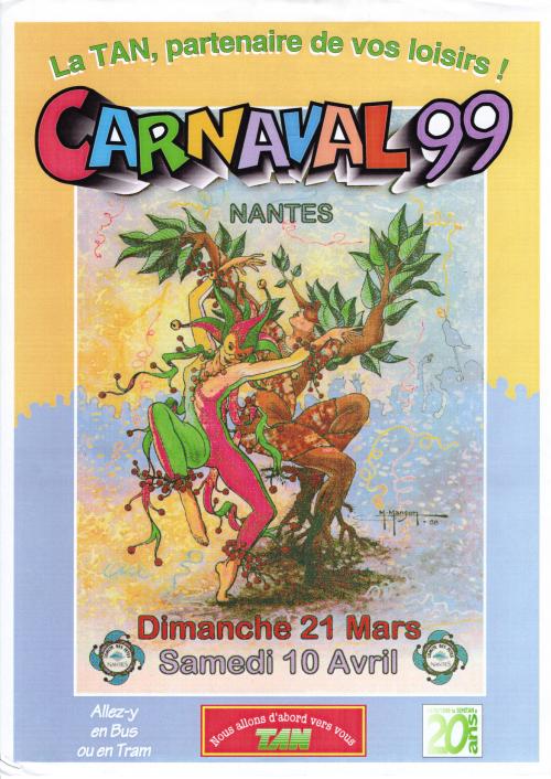 | Note | Affiche du carnaval de Nantes édition 1999 signée M. Manson. Déclinaison avec bandeau publicitaire TAN. Le design de cette affiche a été décliné sur d'autres supports (autres formats d'affiches, cartes postales et programmes). |