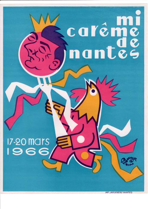 Note Affiches de la mi-carême de Nantes édition 1966 signée par Henri Bouyer. Le design de cette affiche a été décliné sous différents formats et supports (divers tailles d'affiches, cartes postales, flyers et programmes).