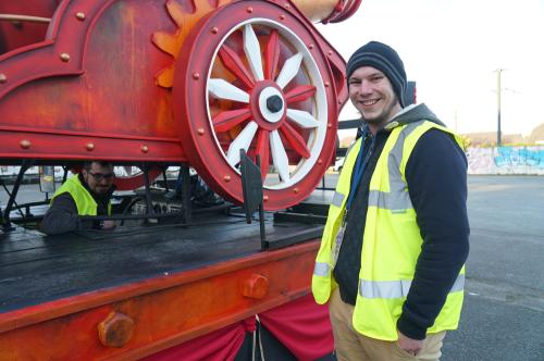 Note | sortie des chars sur le parking de l'atelier, chauffeur et carnavaliers |
