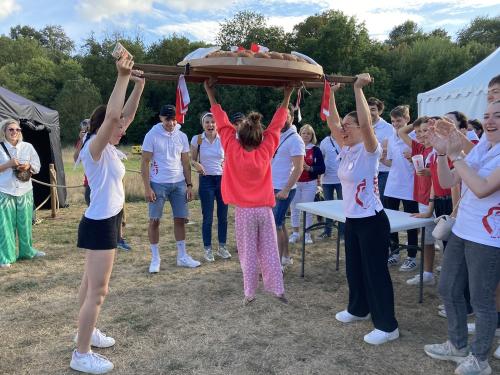 Une petite fille s’essayant au portage de la brioche avec des jeunes des Joyeux Vendéens du Boupère