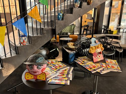 Programmes et déco de carnaval en présentation dans le hall du théâtre Scène nationale d’Albi