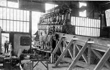 Ouvriers d'Indret posant devant un moteur de bateau