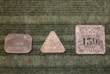 Note | monnaie particulière, échange entre pêcheurs et usiniers, peu d'argent qui circule à l'époque, une forme par usine, calibre correspondant à celui de la sardine. présentation par paniers de 200 sardines. Un panier = un jeton, ensuite éhangé à la semaine ou la quinzaine redistribution des bénéfices au café part en fonction de son rôle sur le bateau. |