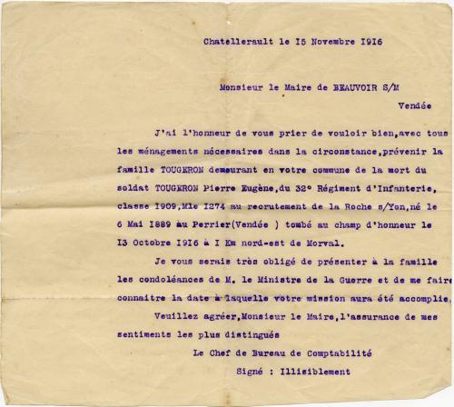 Lettre de la mort de Pierre Eugène Tougeron