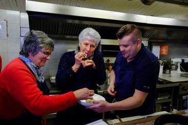 Note | Josette Artus, Annick Artus et Frédéric Farret dégustant des cuisses de grenouille poêlées |