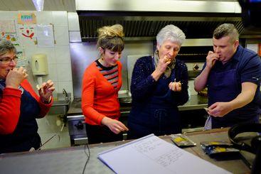 | Note | Josette Artus, Delphine Mougel, Annick Artus et Frédéric Farret dégustant des cuisses de grenouille poêlées |