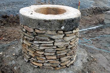 Le puits devant la mairie en cours de restauration