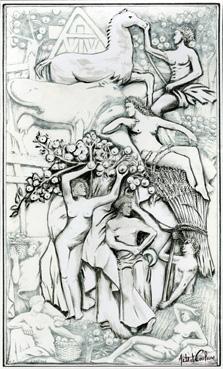 Note dessin de Jean-Pierre Joalland, réalisé en 2016, d'après photographie de Byron Company du bas-relief réalisé en 1935 par Albert Pommier, pour la salle à manger des premières classes du paquebot Normandie. Arts et Cultures