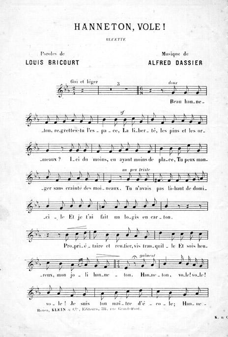 | Incipit du couplet | Beau hanneton, regrettes-tu l'espace? / la liberté, les pins et les ormeaux? |