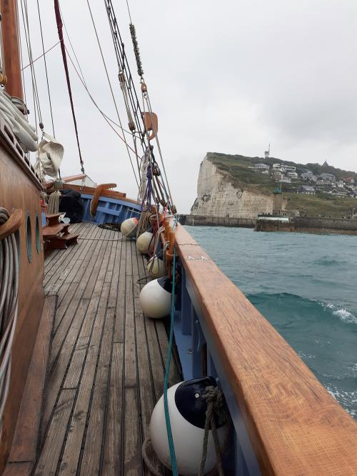 Le pont du voilier fécampois Mil'Pat', le Cap Fagnet et les feux d'entrées du port