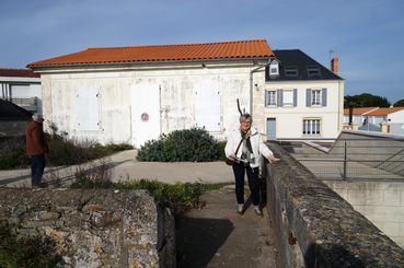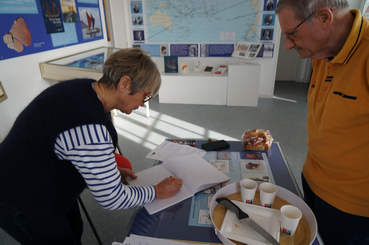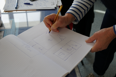 Patricia Dubois dessinant un croquis de la maison des phares et balises lorsqu'elle y habitait
