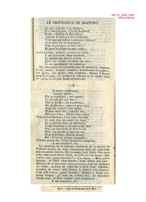 Laforte : non-référencée - VI, Coirault : non-référencée - 1064** Thème : 1064 - Les relations sociales - Métiers Résumé : Enfin l'Pollon du réverbère, Auprès de moi n'a iren de chicard, C'est moi qui enfonce monsieur Chicard, Avec mon air chicocandart, Pour le physique je suis cité, Et pour la chique je suis venté Mots Clé : Monsieur, Messieurs - femme(s), bonne(s) femme(s) - spectacle, concert - roi, reine - prince, princesse - Voir la liste des oeuvres |