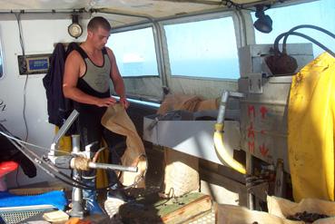 Ensachage des moules sur le bateau atelier