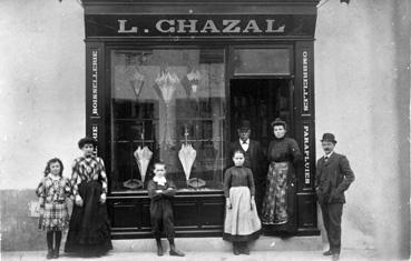 Note | Magasin de coutellerie, boissellerie, ombrelles et parapluies tenu par Jean Léger CHAZAL (1876, Larrode, Puy de Dôme, 1957 La Roche-sur-Yon. En habit sombre sur la photo ci-dessus), à partir de 1910, 56 rue Nationale (appelée aussi Grande Rue). |