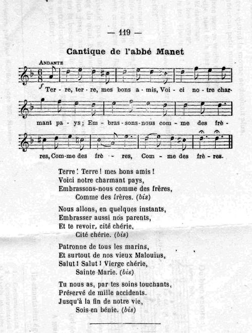 Laforte : non référencée - II, Coirault : non référencée - 1081** Thème : 1081 - La religion - Religieuses diverses Résumé : Terre terre mes bons amis, Voici notre charmant pays. Embrassons-nous comme des frères. Nous allons en quelques instants, Embrasser aussi nos parents, Patronne de tous les marins, Et surtout de nos vieux Malouins. Mots Clé : vierge, sainte Vierge, - parent(s) - baiser, embrassade - marin(s) pêcheur(s) - Voir la liste des oeuvres |