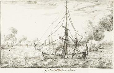 Galiote à bombes tirant sur une ville portuaire.