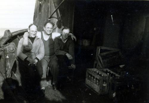 Trois marins posant à l'arrière d'un bateau