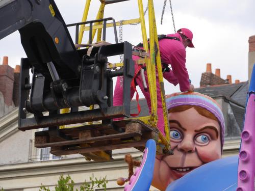 Note | Damien Lemasson sur une grue pour remonter les éléments du char avant le défilé de nuit |