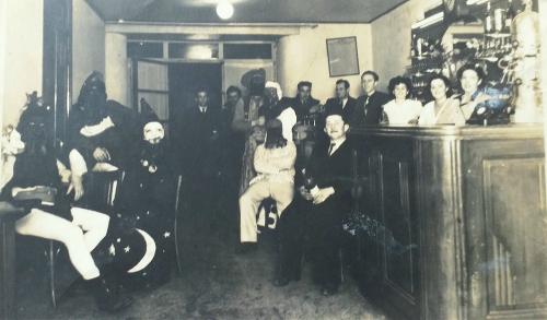 Note | vieille photo de Gras dans un bar, homme portant des dominos |