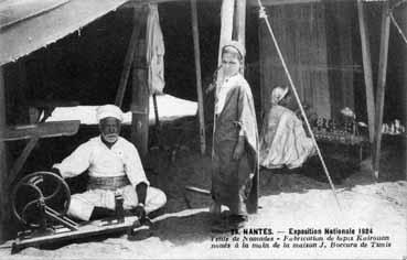 Note | "Nantes exposition Nationale 1924. Tente de Nomades. Fabrication de tapis Kairouarn noués à la main de la maison J. Boccara de Tunis." |