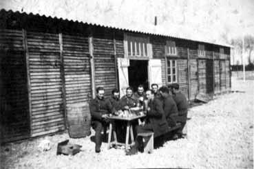 Repas de militaires devant leur baraquement