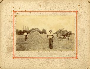 | Note | Agriculteurs lors de la récolte du foin. Le petit tas portait le nom de "mulon", fait sur le terrain en attendant d'être "engrangé" ou mis en "barge", un très gros tas de foin sur une "aire". Le foin devait être arrangé de tel sorte qu'il ne prenne pas l'eau. Pour cela, il y avait dans les villages un conducteur de barge, car tous les voisins s'entraidaient pour les gros travaux. |