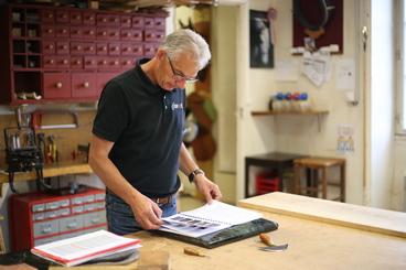 | Note | Michel Charrier consultant la liste des outils de sellier-harnacheur dressée par lui-même |