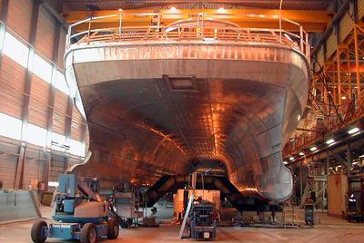 Construction du premier catamaran, par les chantiers Fejllstrand, Norvège