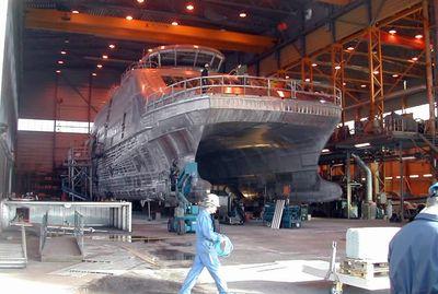 Construction du premier catamaran, par les chantiers Fejllstrand, Norvège